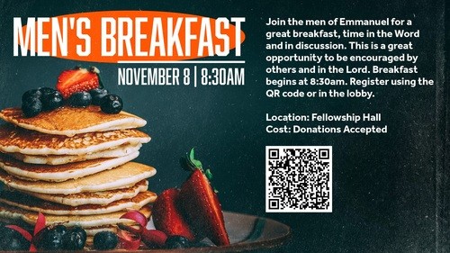 Join the men of Emmanuel for a great breakfast, time in the Word, and in discussion. This is a great opportunity to be encouraged by others in the Lord. Breakfast begins at 8:30AM. Register online or at the Information Desk of the church lobby.